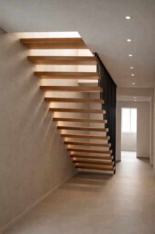 Interiérové schodiště je navrženo v moderním minimalistickém stylu s důrazem na vzdušnost, jednoduchost a kvalitní materiály. Otevřené stupně z přírodního dřeva vynikají svou kresbou i teplým odstínem, který příjemně kontrastuje s černými kovovými prvky. Dominantou celé realizace je vertikální zábradlí tvořené štíhlými ocelovými pruty, jež opticky odlehčuje prostor a zároveň zajišťuje bezpečnost. Schodiště přirozeně zapadá do současného interiéru a stává se jeho výrazným designovým prvkem.